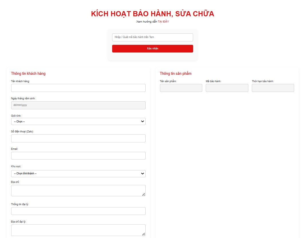 Mục đích: Kích hoạt bảo hành cho sản phẩm được dán tem/mã.